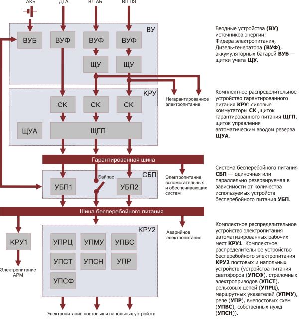 Это достигается применением мощных устройств бесперебойного питания (УБП), в которых используется аккумуляторная батарея (АКБ), рассчитанная на продолжительность энергоснабжения не менее двух часов. При этом сложные вычислительные комплексы микропроцессорных централизаций получают идеально качественное энергоснабжение от преобразователей УБП, а время переключения при переходе на батарею равно нулю благодаря использованию on-line архитектуры УБП.