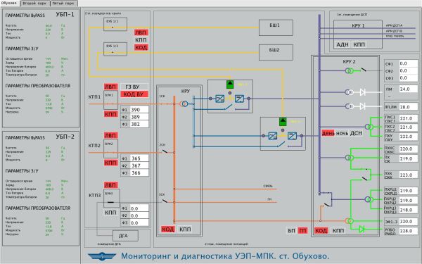 Получаемая в АРМ ШН на основе совокупности дискретных и аналоговых величин логическая модель функционирования УЭП-МПК позволяет получить визуальный контроль места отказа на схеме системы, а также своевременно информировать обслуживающий персонал о прогнозируемых предельных и недопустимых параметрах энергоснабжения.